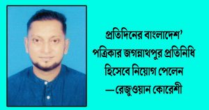 প্রতিদিনের বাংলাদেশ’ পত্রিকার জগন্নাথপুর প্রতিনিধি হিসেবে নিয়োগ পেলেন- রেজুওয়ান কোরেশী